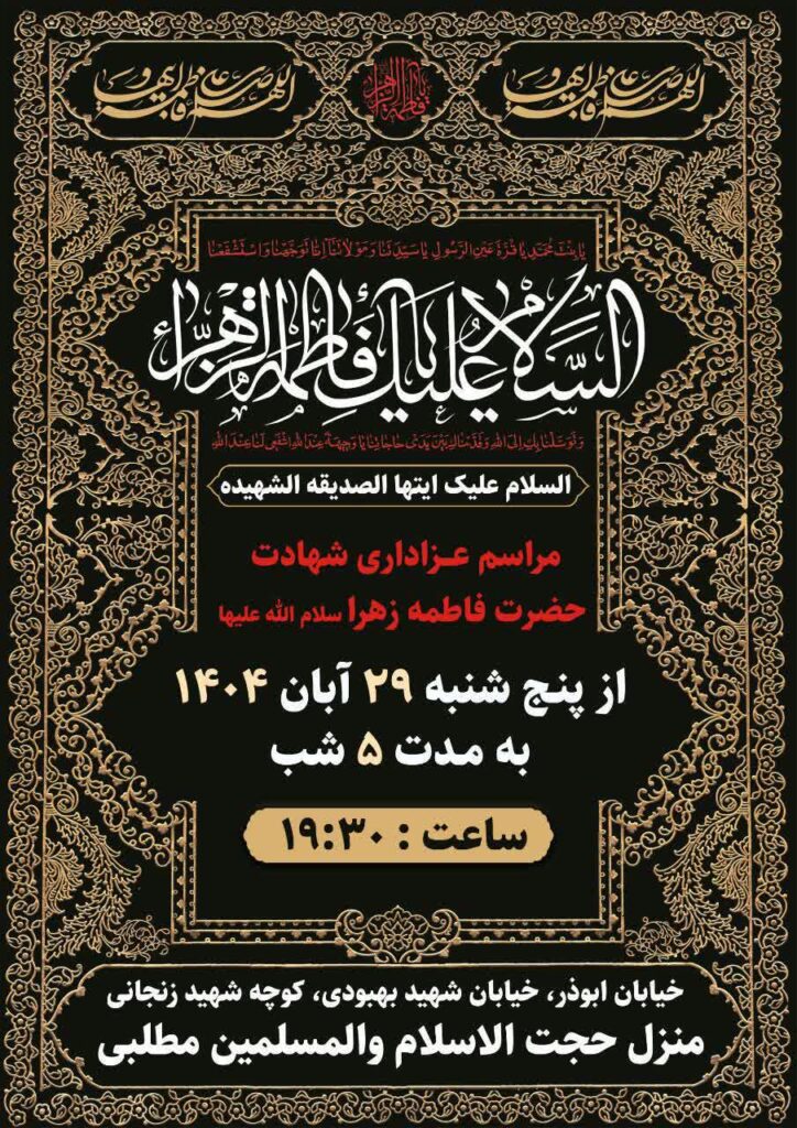 مراسم سوگواری ایام شهادت یگانه بانوی دو عالم حضرت فاطمه زهرا (س)، از تاریخ از پنجشنبه ۲۹ آبان ۱۴۰۴ به مدت ۵شب از ساعت ۱۹:۳۰ در خیابان ابوذر ، خیابان شهید بهبودی، کوچه شهید زنجانی برقرارمی باشد.