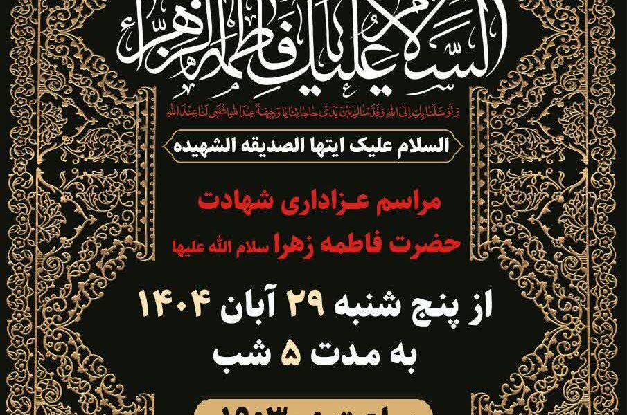 مراسم سوگواری ایام شهادت یگانه بانوی دو عالم حضرت فاطمه زهرا (س)، از تاریخ از پنجشنبه ۲۹ آبان ۱۴۰۴ به مدت ۵شب از ساعت ۱۹:۳۰ در خیابان ابوذر ، خیابان شهید بهبودی، کوچه شهید زنجانی برقرارمی باشد.