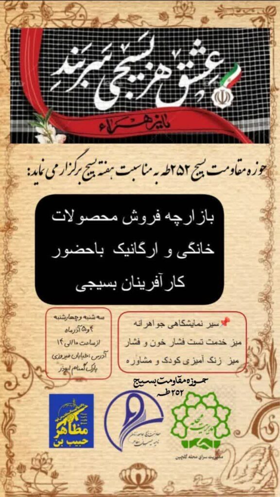 بازارچه فروش محصولات خانگی و ارگانیک با حضور خواهران بسیجی کارآفرین فردا در زمان صبح کنسل می باشد و به بعدازظهر از ساعت ۱۷ الی ۱۹در میدان ابوذر برگزار می شود.