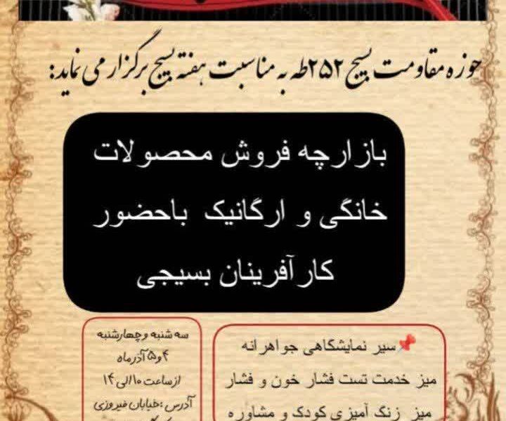 بازارچه فروش محصولات خانگی و ارگانیک با حضور خواهران بسیجی کارآفرین فردا در زمان صبح کنسل می باشد و به بعدازظهر از ساعت ۱۷ الی ۱۹در میدان ابوذر برگزار می شود.