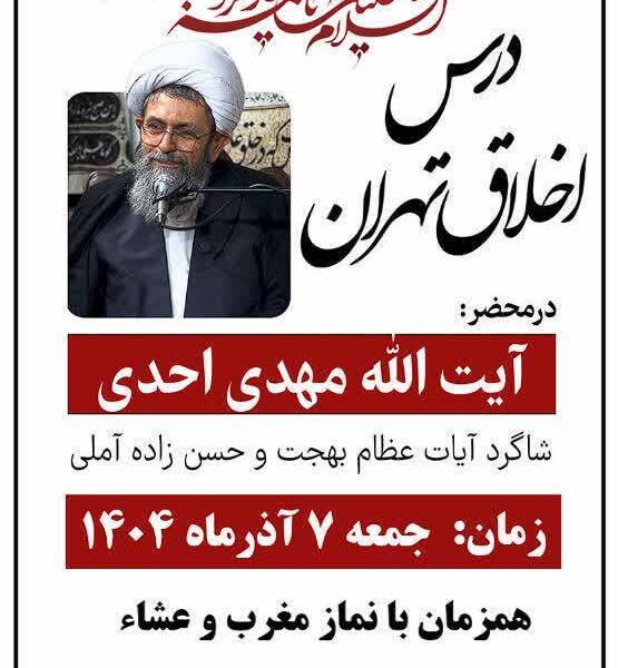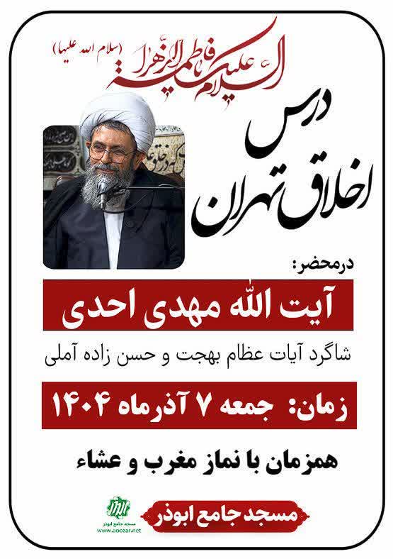 پایگاه اطلاع رسانی مسجد جامع ابوذر دارالشهدای تهران ، «درس اخلاق تهران»در محضر آیت الله مهدی احدی شاگردآیات عظام بهجت وحسن زاده آملی ، جمعه ۷ آذر ماه ۱۴۰۴همزمان با نماز مغرب و عشاء در مسجدجامع ابوذر برگزار می گردد