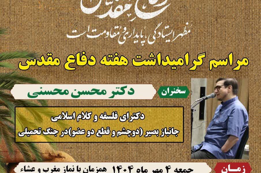 مراسم گرامیداشت هفته دفاع مقدس ، با سخنرانی دکترمحسن محسنی دکترای و فلسفه و کلام اسلامی جانباز بصیر(دوچشم وقطع دوعضو) در جنگ تحمیلی ، روز جمعه ۴مهرماه ۱۴۰۴